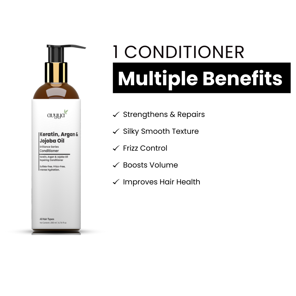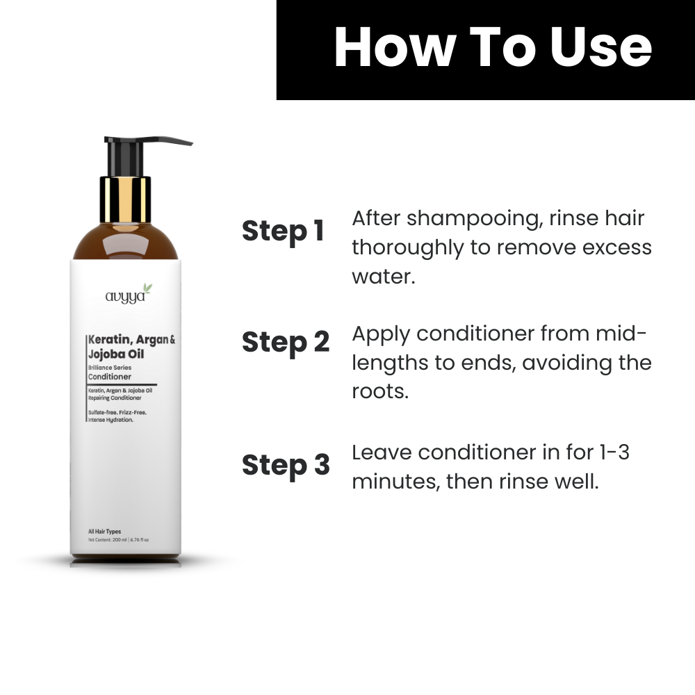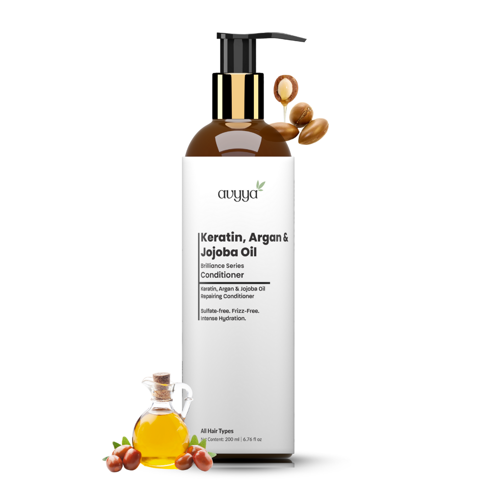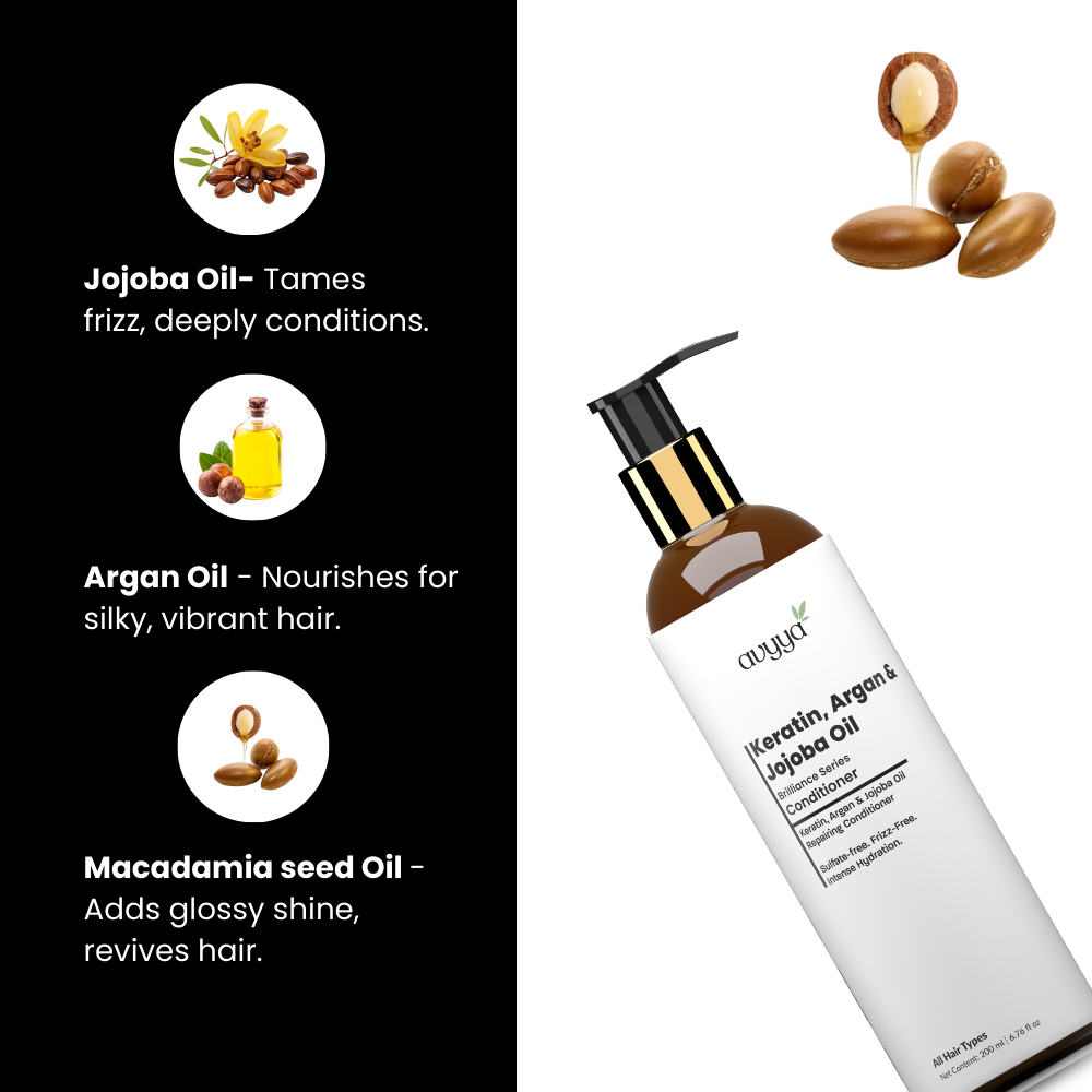 Ans:- Avyya Brilliance conditioner contains jojoba, argan, and macadamia seed oils with hydrolyzed keratin for ultimate conditioning.