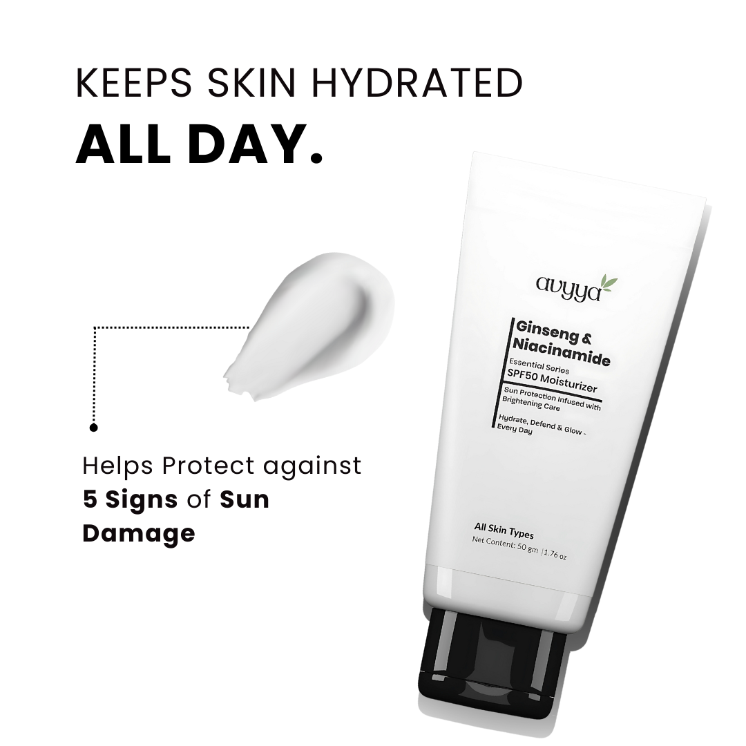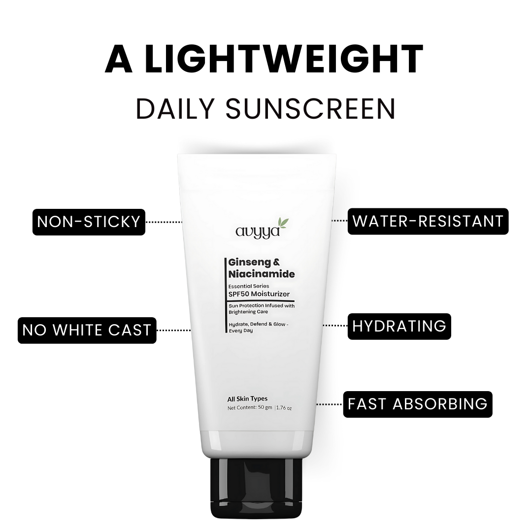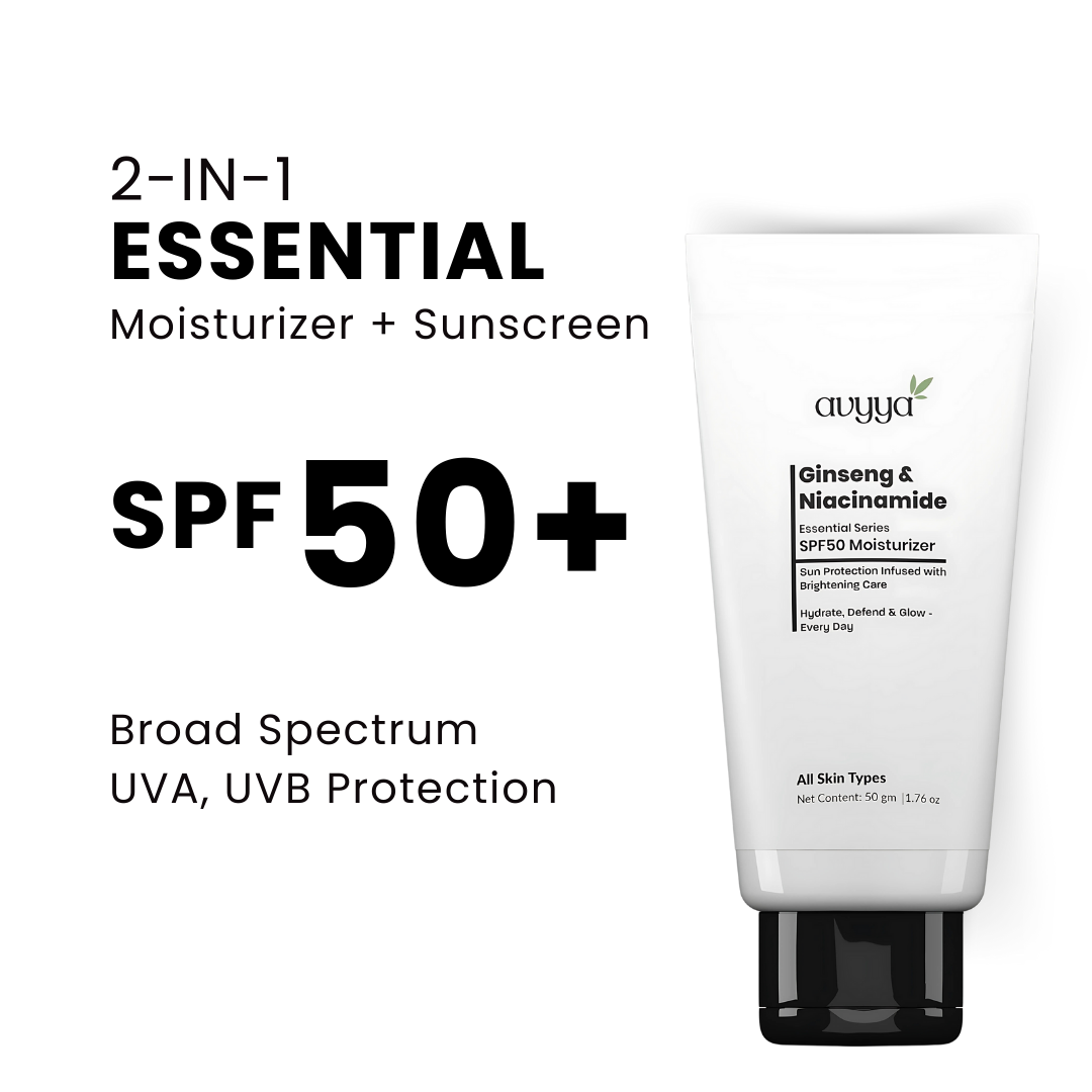 Avyya Essential Moisturizer + Sunblock SPF 50+ PA+++ | Broad Spectrum UVA & UVB Protection | Non-Greasy, Lightweight, Fast Absorbing | No White Cast, Water-Resistant | Suitable for All Skin Types, Men & Women | Prevents Tanning & Pigmentation (1.76 oz)