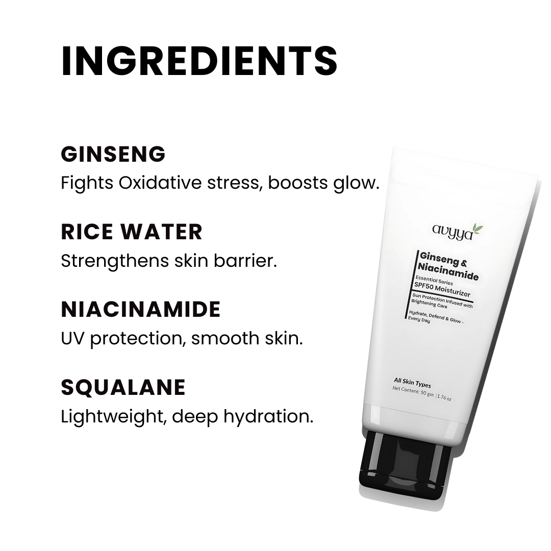 Ans:- Our Avyya Essential SPF with Moisturizer contains a blend of natural active ingredients to protect and nourish your skin: