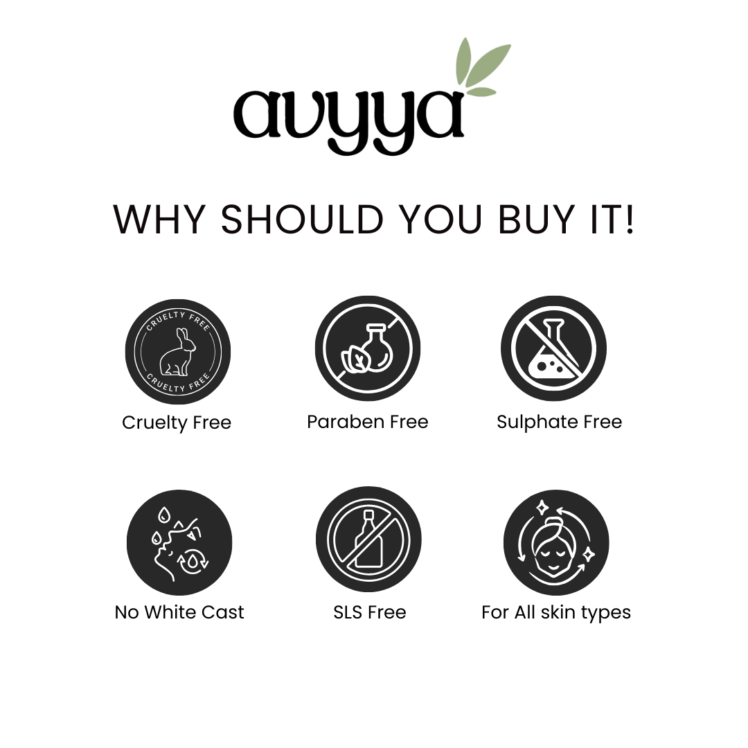 Ans:- Avyya Essential SPF with Moisturizer is a 2-in-1 product that provides full-spectrum sun protection and deep hydration in one step. Saves your time and money while giving your skin the protection it needs, without the harmful chemicals.