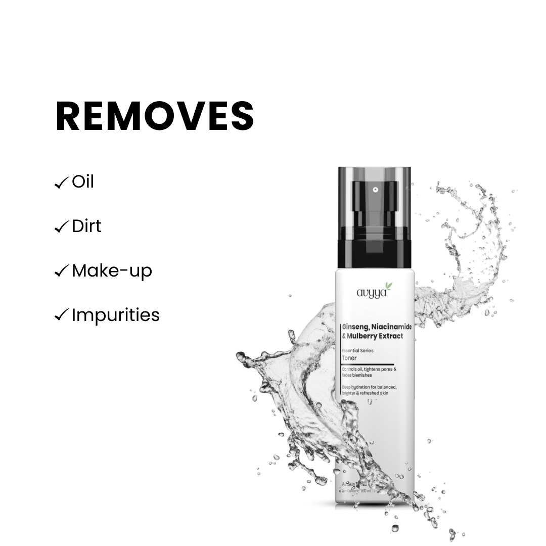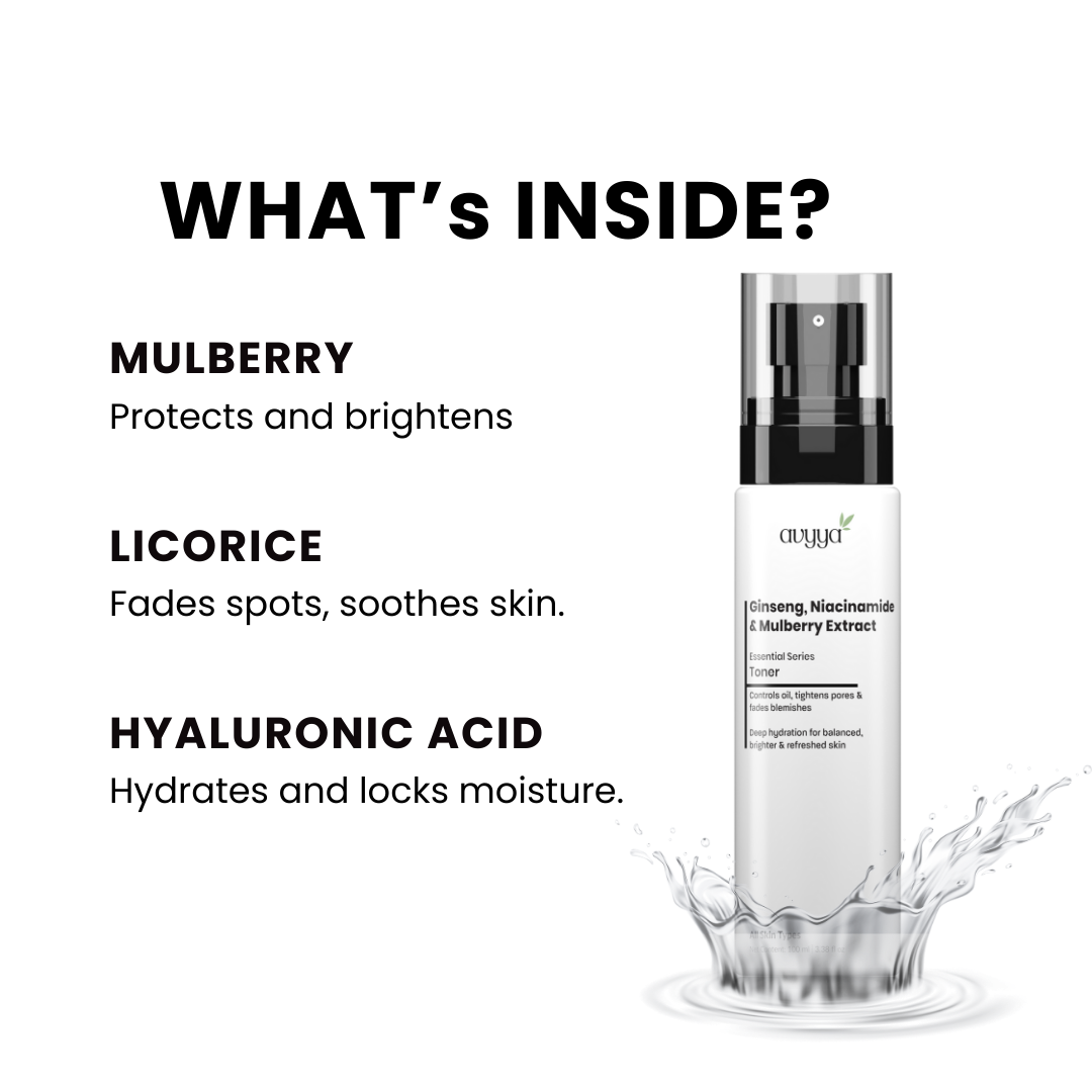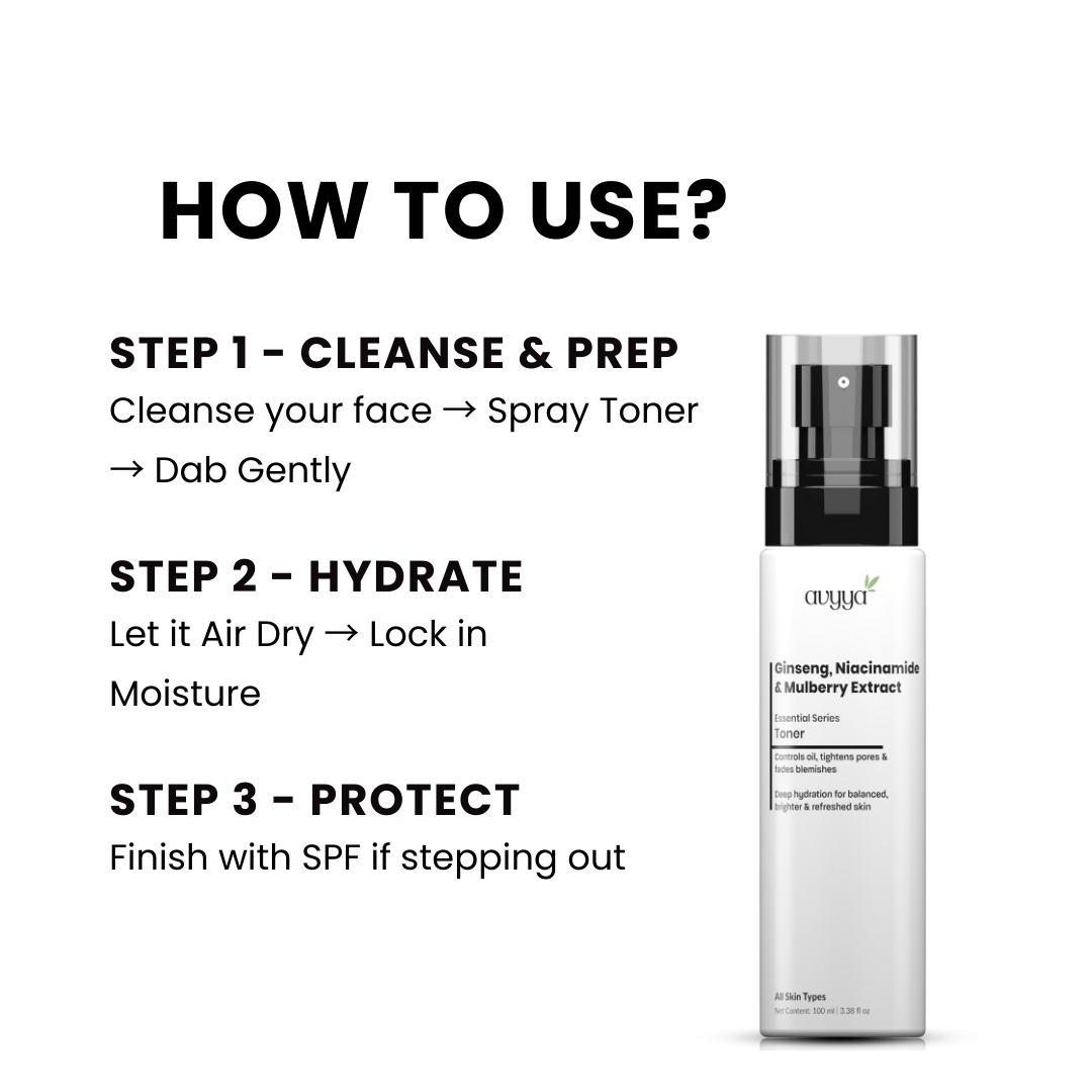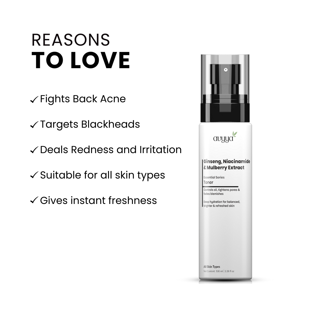 Avyya Essential Face Toner & Spray Mist for Oily, Acne-Prone Skin | Alcohol-Free with Ginseng, Niacinamide, Mulberry Extract & Hyaluronic Acid | Pore Tightening, Oil Control, Exfoliates Dead Skin & Fades Blemishes | Hydrates & Brightens | For All Skin Types, Men & Women (3.38 fl oz)